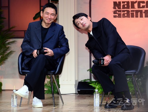 7일 서울 역삼동 조선팰리스 서울강남에서 열린 넷플릭스 ‘수리남’ 제작발표회에 참석한 황정민과 하정우가 다정한 모습으로 포즈를 취하고 있다.