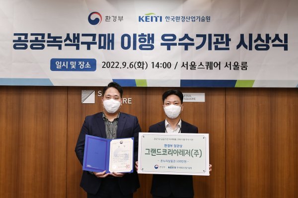 녹색제품이란 에너지 자원 소모와 오염물질 및 온실가스 발생을 최소화하려는 제품으로 환경표지 인증제품, 우수재활용 인증제품, 저탄소 인증제품을 말한다. 한국환경산업기술원은 총 933개 공공기관을 대상으로 2021년도 구매실적 연속적 증가 여부, 전년도 대비 구매액 증가율, 녹색구매 노력도 및 계획 제출 성실도를 평가했다. 그랜드코리아레저는 직원을 대상으로 한 녹색제품 구매 교육 노력과 전년 대비 두 배 이상 증가한 녹색제품 구매실적을 인정받아 우수기관에 선정됐다.