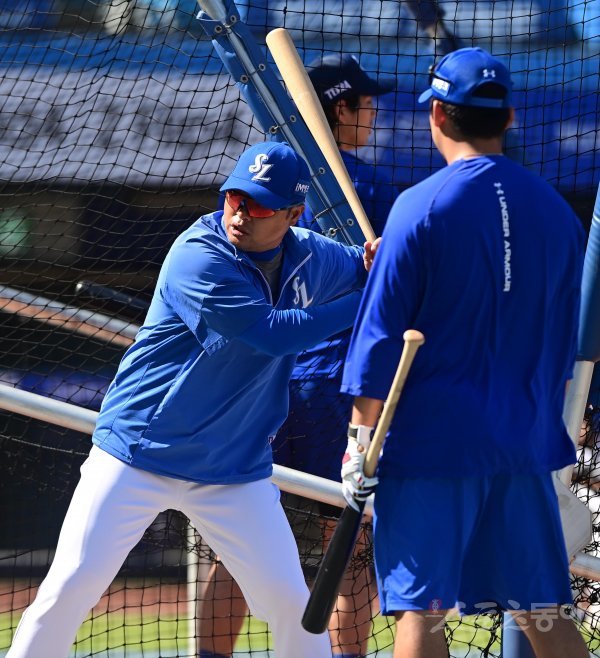 7일 대구 삼성라이온즈파크에서 열린 ‘2022 신한은행 SOL KBO리그’ 삼성 라이온즈와 키움 히어로즈의 경기에 앞서 삼성 박한이 코치가 선수와 이야기를 하고 있다.