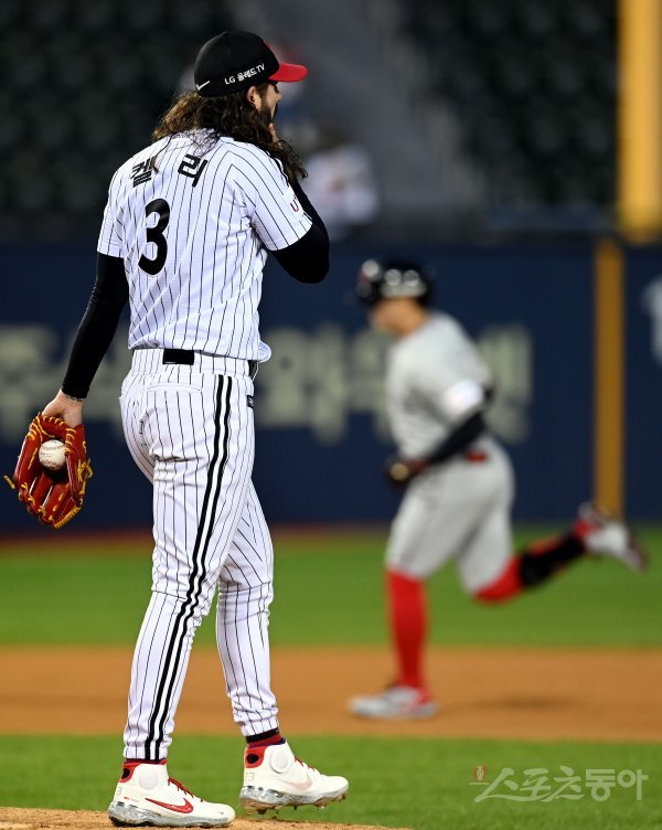 7일 서울 잠실야구장에서 ‘2022 신한은행 SOL KBO리그’ LG 트윈스와 SSG 랜더스의 경기가 열렸다. 3회초 2사에서 LG 선발 켈리가 홈런을 허용한 후 아쉬워하고 있다.