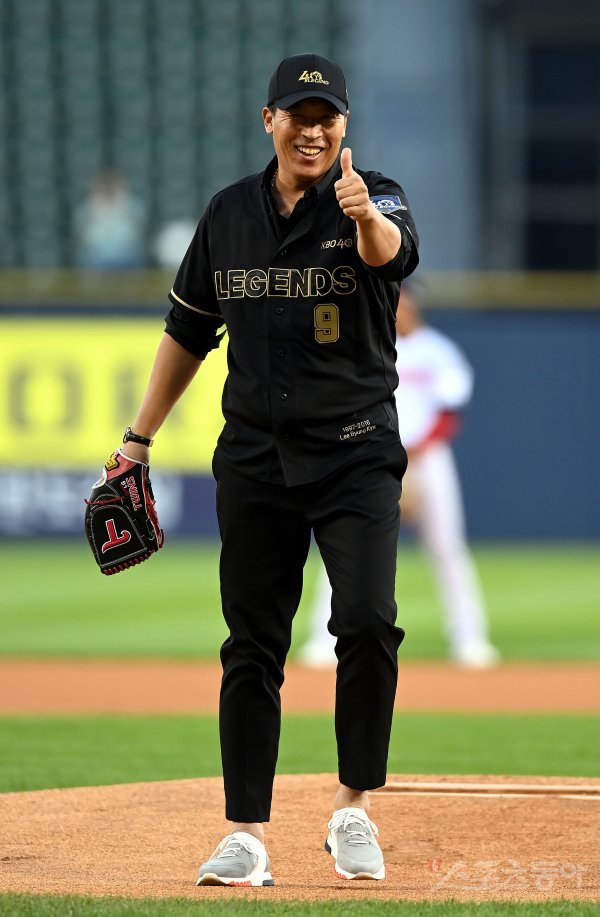 7일 서울 잠실야구장에서 ‘2022 신한은행 SOL KBO리그’ LG 트윈스와 SSG 랜더스의 경기가 열렸다. 경기에 앞서 KBO 레전드 40인에 선정된 LG 이병규 코치가 시구를 던진 후 엄지척을 표시하고 있다.