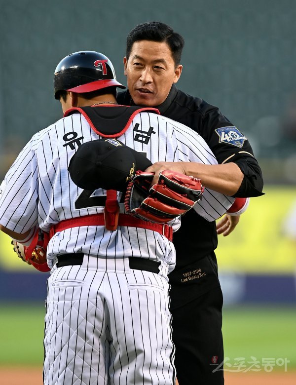 7일 서울 잠실야구장에서 ‘2022 신한은행 SOL KBO리그’ LG 트윈스와 SSG 랜더스의 경기가 열렸다. 경기에 앞서 KBO 레전드 40인에 선정된 LG 이병규 코치가 시구를 던진 후 유강남과 포옹을 나누고 있다.