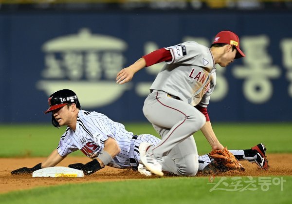7일 서울 잠실야구장에서 ‘2022 신한은행 SOL KBO리그’ LG 트윈스와 SSG 랜더스의 경기가 열렸다. 4회말 1사 1루에서 LG 박해민이 2루 도루를 성공시키고 있다.
