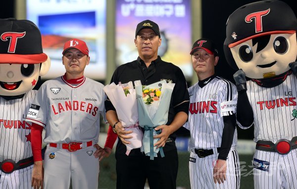 7일 서울 잠실야구장에서 ‘2022 신한은행 SOL KBO리그’ LG 트윈스와 SSG 랜더스의 경기가 열렸다. KBO 레전드 40인에 선정된 LG 이병규 코치가 SSG 김원형 감독, LG 류지현 감독과 기념촬영을 하고 있다.