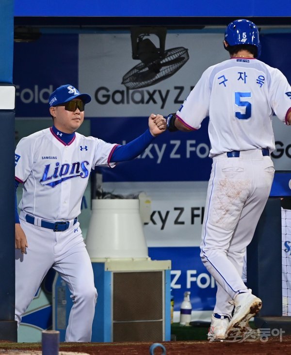 7일 대구 삼성라이온즈파크에서 열린 ‘2022 신한은행 SOL KBO리그’ 삼성 라이온즈와 키움 히어로즈의 경기에서 5회말 2사 1루 삼성의 우전 안타 때 삼성 1루주자 구자욱이 타자 주자를 수비하는 사이 홈으로 파고들어 득점에 성공해 박진만 감독대행의 축하를 받고 있다.