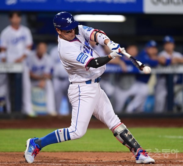 7일 대구 삼성라이온즈파크에서 열린 ‘2022 신한은행 SOL KBO리그’ 삼성 라이온즈와 키움 히어로즈의 경기에서 5회말 2사 1루 삼성 강민호가 우전 안타를 치고 있다.