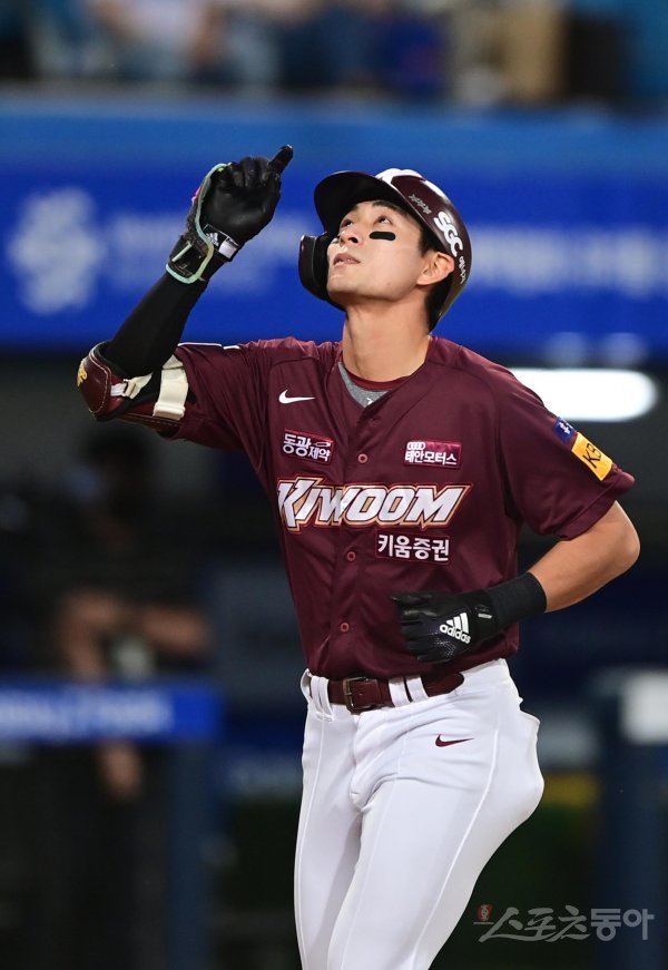 7일 대구 삼성라이온즈파크에서 열린 ‘2022 신한은행 SOL KBO리그’ 삼성 라이온즈와 키움 히어로즈의 경기에서 7회초 무사 키움 이정후가 동점 우월 솔로 홈런을 친 후 세리머니를 하고 있다.