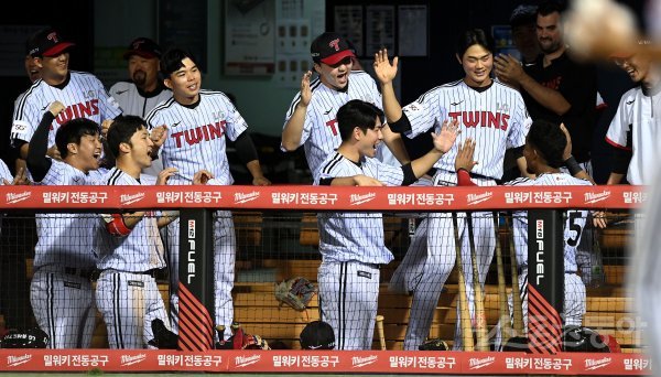 7일 서울 잠실야구장에서 ‘2022 신한은행 SOL KBO리그’ LG 트윈스와 SSG 랜더스의 경기가 열렸다. 7회말 2사 2루에서 역전타 때 득점에 성공한 LG 가르시아가 동료들의 환영을 받고 있다.