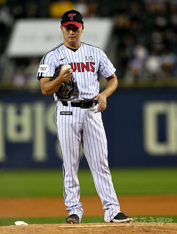 7일 서울 잠실야구장에서 ‘2022 신한은행 SOL KBO리그’ LG 트윈스와 SSG 랜더스의 경기가 열렸다. 9회초 1사에서 동점 홈런을 허용한 LG 마무리 고우석이 아쉬워하고 있다.