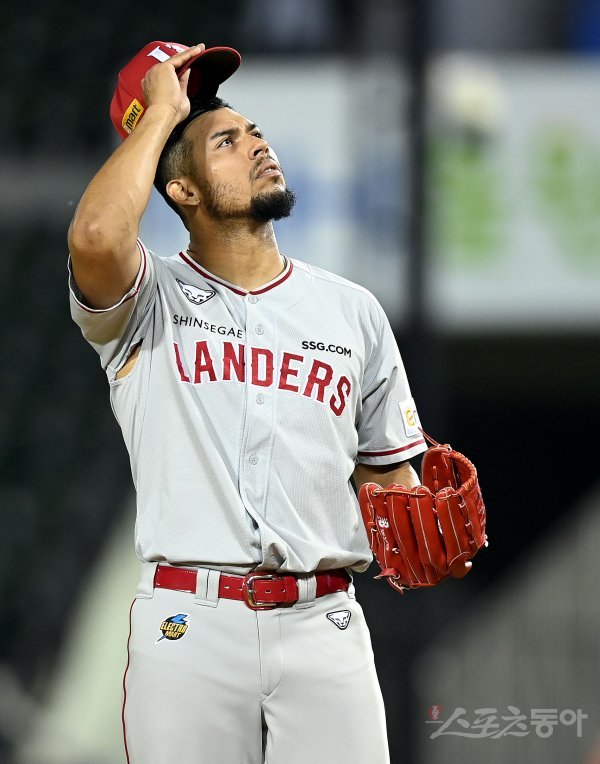 7일 서울 잠실야구장에서 ‘2022 신한은행 SOL KBO리그’ LG 트윈스와 SSG 랜더스의 경기가 열렸다. 7회말 2사 2루에서 동점타를 허용한 SSG 폰트가 아쉬워하고 있다.