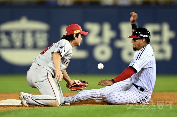 7일 서울 잠실야구장에서 ‘2022 신한은행 SOL KBO리그’ LG 트윈스와 SSG 랜더스의 경기가 열렸다. 7회말 2사 1루에서 LG 가르시아가 2루 도루를 성공시키고 있다.