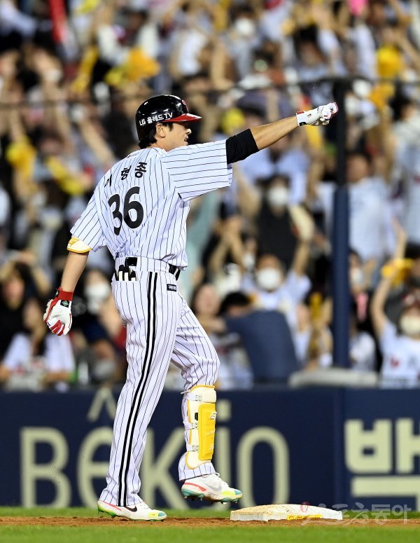 7일 서울 잠실야구장에서 ‘2022 신한은행 SOL KBO리그’ LG 트윈스와 SSG 랜더스의 경기가 열렸다. 7회말 2사 2루에서 LG 대타 이형종이 1타점 역전 적시타를 날린 후 환호하고 있다.