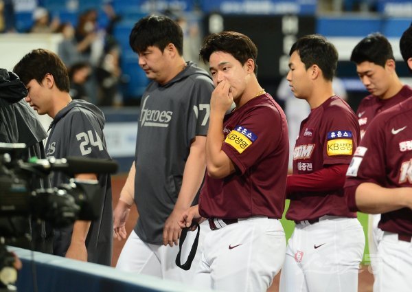 7일 대구 삼성라이온즈파크에서 열린 ‘2022 신한은행 SOL KBO리그’ 삼성 라이온즈와 키움 히어로즈의 경기에서 삼성에 1-2로 끝내기 패배를 당한 키움 선수들이 더그아웃으로 향하고 있다.