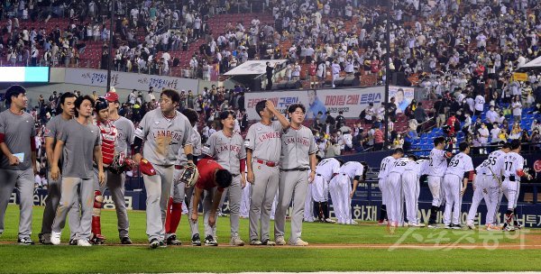 7일 서울 잠실야구장에서 ‘2022 신한은행 SOL KBO리그’ LG 트윈스와 SSG 랜더스의 경기가 열렸다. SSG와 LG가 연장 12회 2-2 무승부를 기록한 후 양 팀 선수들이 팬들에게 인사하고 있다.