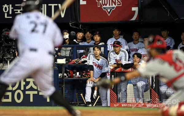 7일 서울 잠실야구장에서 ‘2022 신한은행 SOL KBO리그’ LG 트윈스와 SSG 랜더스의 경기가 열렸다. 연장 12회말 2사에서 LG 선수들이 경기를 지켜보고 있다.