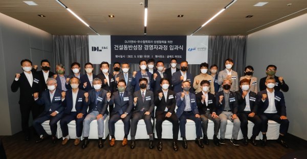 DL이앤씨가 업계 최초로 협력회사를 위한 맞춤형 대학원 교육지원 프로그램을 개설해 운영한다. 최근 중앙대와 교육협력 업무협약을 체결하고 ‘건설 동반성장 경영자 과정’을 개설했다. 협력회사와의 동반성장 및 상생협력 강화를 통해 ESG경영을 실천하기 위해서다. 9월부터 12월까지 15주 동안 중앙대에서 진행되는 이번 교육 과정에는 DL이앤씨의 우수 협력회사로 선정된 한숲 파트너스 등 20개 중소기업 대표이사가 참여한다. 5일 서울 여의도 글래드호텔에서 열린 ‘건설 동반성장 경영자 과정 입과식’에서 참석자들이 기념촬영을 하고 있다.