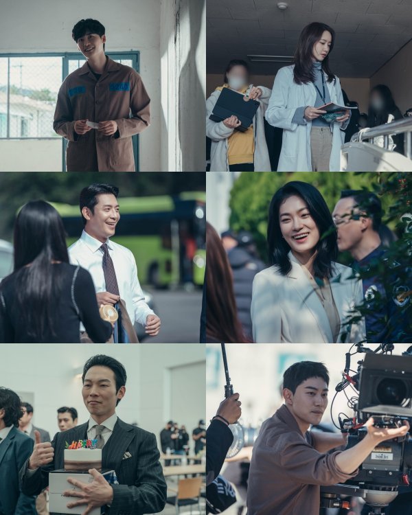 그런가 하면 구천시장이 아닌 구천시 빌런 최도하로 반전을 선사한 김주헌은 악(惡)이 전혀 느껴지지 않는 소탈한 미소가 돋보인다. 이어 냉철하고 이지적인 카리스마가 돋보이는 현주희 역의 옥자연 또한 해맑은 얼굴로 주변을 환하게 밝힌다. 여기에 촬영장에서 생일을 맞이한 양경원, 특별출연으로 남다른 존재감을 과시하고 있는 곽동연까지 배우들의 색다른 모습이 보는 즐거움을 고조시킨다.