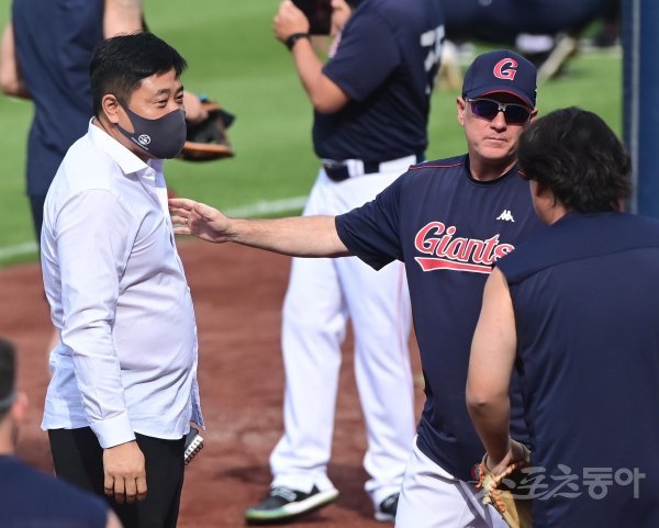 8일 대구 삼성라이온즈파크에서 열린 ‘2022 신한은행 SOL KBO리그’ 삼성 라이온즈와 롯데 자이언츠의 경기에 앞서 롯데 서튼 감독과 양준혁이 코치진과 이야기를 하고 있다.