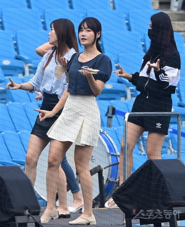 8일 대구 삼성라이온즈파크에서 열린 ‘2022 신한은행 SOL KBO리그’ 삼성 라이온즈와 롯데 자이언츠의 경기에 앞서 삼성 치어리더들이 응원 단상에서 리허설을 하고 있다.