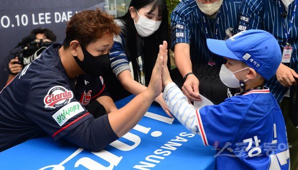 8일 대구 삼성라이온즈파크에서 열린 ‘2022 신한은행 SOL KBO리그’ 삼성 라이온즈와 롯데 자이언츠의 경기에 앞서 롯데 이대호가 은퇴투어 기념 팬사인회에서 어린이 팬과 하이파이브를 하고 있다.