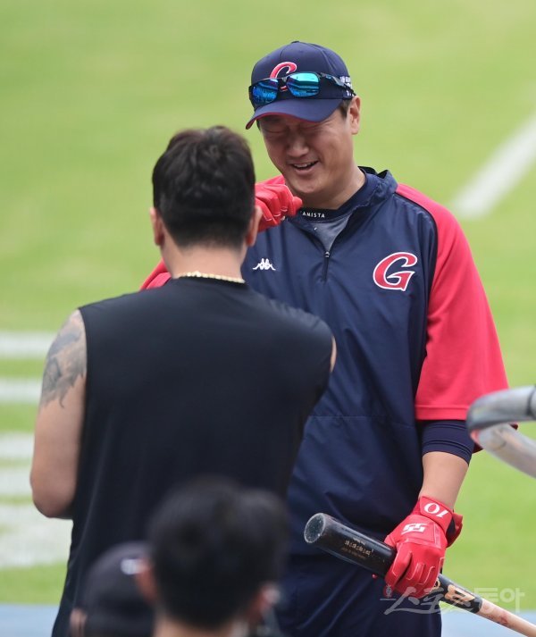 8일 대구 삼성라이온즈파크에서 열린 ‘2022 신한은행 SOL KBO리그’ 삼성 라이온즈와 롯데 자이언츠의 경기에 앞서 롯데 이대호와 삼성 강민호가 장난을 치고 있다.