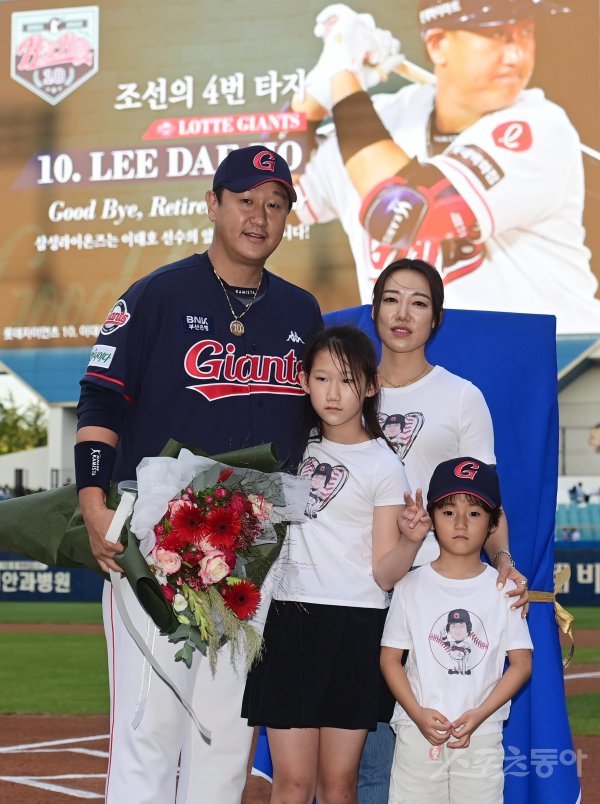 8일 대구 삼성라이온즈파크에서 열린 ‘2022 신한은행 SOL KBO리그’ 삼성 라이온즈와 롯데 자이언츠의 경기에서 롯데 이대호가 은퇴투어에서 가족들과 기념 촬영을 하고 있다.