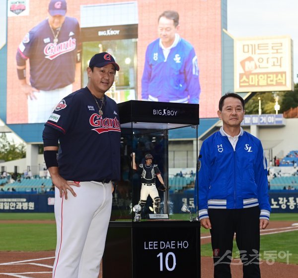 8일 대구 삼성라이온즈파크에서 열린 ‘2022 신한은행 SOL KBO리그’ 삼성 라이온즈와 롯데 자이언츠의 경기에서 롯데 이대호가 은퇴투어에서 삼성 원기찬 대표로부터 특별 선물을 받아 기념 촬영을 하고 있다.