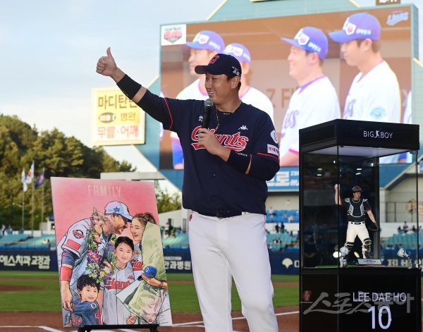 8일 대구 삼성라이온즈파크에서 열린 ‘2022 신한은행 SOL KBO리그’ 삼성 라이온즈와 롯데 자이언츠의 경기에 앞서 롯데 이대호가 은퇴투어에서 인사말을 하고 있다.