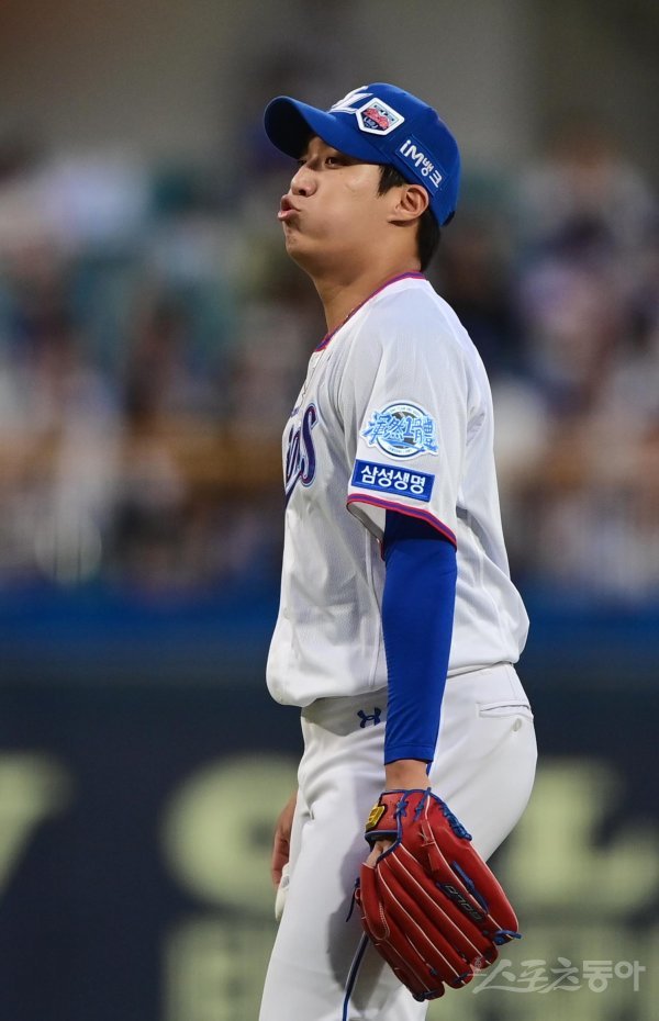 8일 대구 삼성라이온즈파크에서 열린 ‘2022 신한은행 SOL KBO리그’ 삼성 라이온즈와 롯데 자이언츠의 경기에서 1회초 만루 위기를 무실점으로 막은 삼성 원태인이 숨을 몰아쉬고 있다.