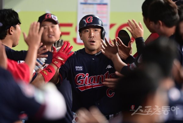 8일 대구 삼성라이온즈파크에서 열린 ‘2022 신한은행 SOL KBO리그’ 삼성 라이온즈와 롯데 자이언츠의 경기에서 4회초 1사 3루 롯데의 희생플라이 때 3루주자 전준우가 득점에 성공한 후 더그아웃에서 동료들의 축하를 받고 있다.