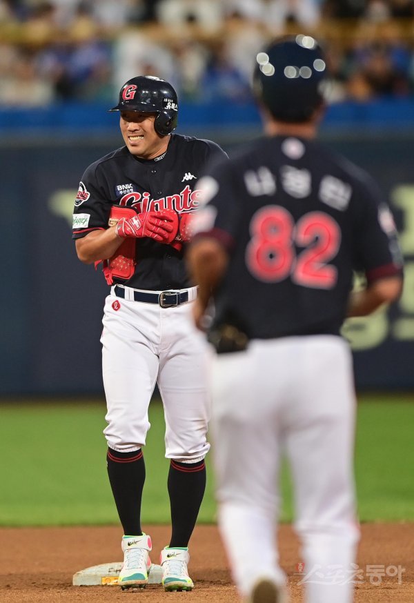 8일 대구 삼성라이온즈파크에서 열린 ‘2022 신한은행 SOL KBO리그’ 삼성 라이온즈와 롯데 자이언츠의 경기에서 4회초 무사 롯데 전준우가 중전 2루타를 친 후 보호 장비를 벗고 있다.