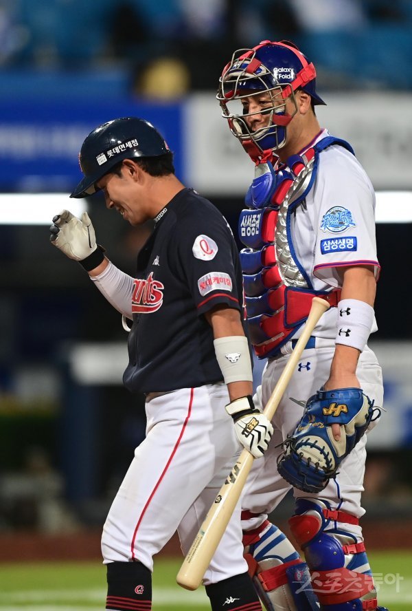 8일 대구 삼성라이온즈파크에서 열린 ‘2022 신한은행 SOL KBO리그’ 삼성 라이온즈와 롯데 자이언츠의 경기에서 5회초 2사 투수 방향으로 배트를 놓친 롯데 황성빈과 삼성 강민호가 이야기를 하고 있다.