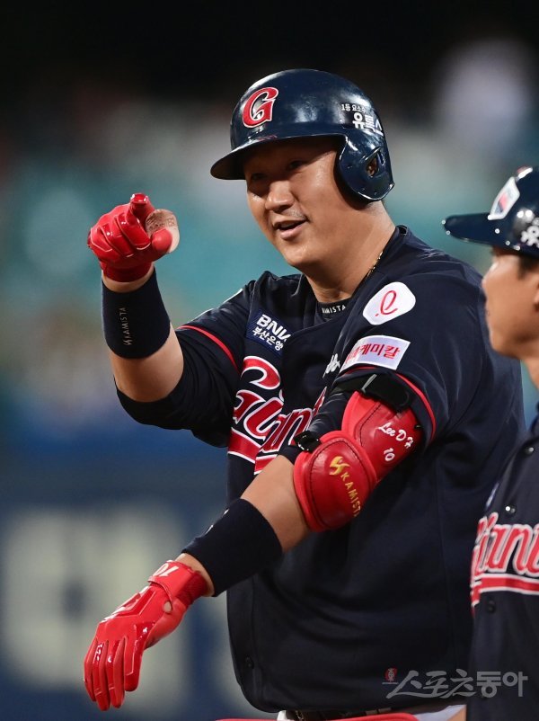 8일 대구 삼성라이온즈파크에서 열린 ‘2022 신한은행 SOL KBO리그’ 삼성 라이온즈와 롯데 자이언츠의 경기에서 6회초 무사 롯데 이대호가 중전 안타를 친 후 더그아웃을 향해 세리머니를 하고 있다.