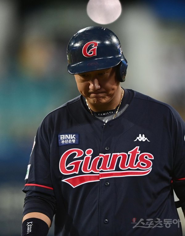 8일 대구 삼성라이온즈파크에서 열린 ‘2022 신한은행 SOL KBO리그’ 삼성 라이온즈와 롯데 자이언츠의 경기에서 8회초 무사 1루 롯데 이대호가 중견수 뜬공으로 아웃된 후 아쉬워하고 있다.