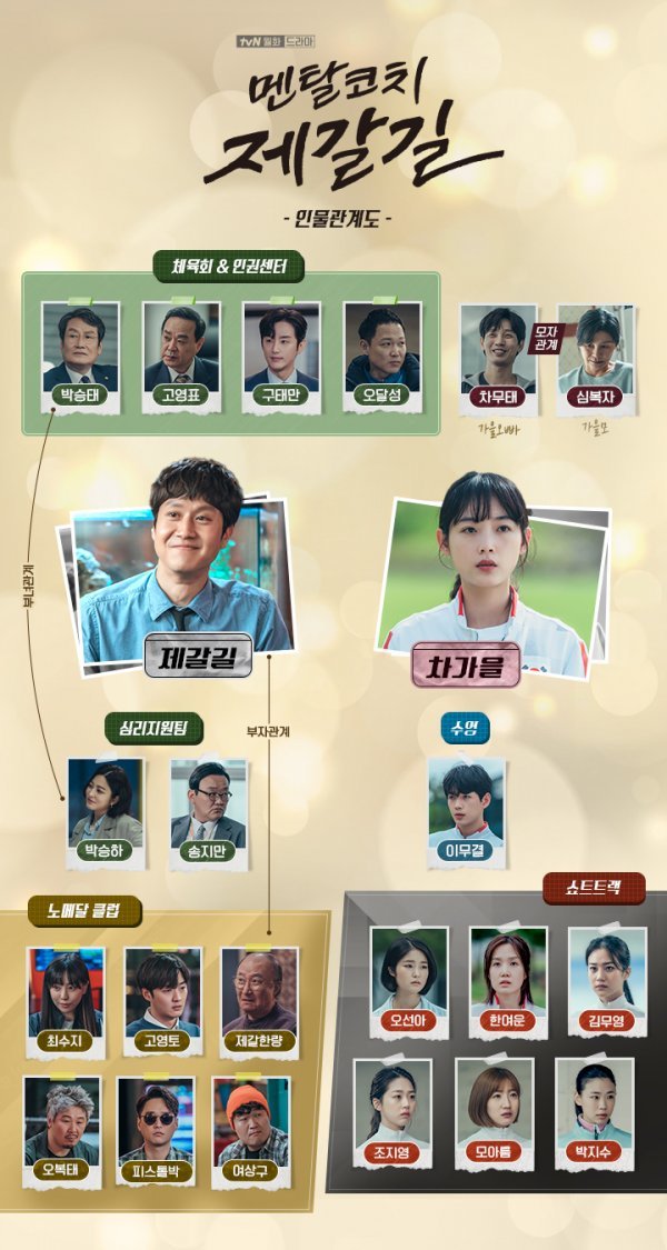 제작진은 9일 인물관계도를 공개했다. 인물관계도에는 멘탈코치 제갈길(정우 분)과 쇼트트랙 유망주 차가을(이유미 분)을 중심으로 국가대표 선수촌을 둘러싼 각 인물 관계가 담긴다. 태권도 국가대표 출신인제갈길은 영구 제명된 지 13년 만에 멘탈코치로 선수촌에 재입성, 슬럼프를 극복하고 재기를 노리는 차가을의 멘탈 케어를 맡게 될 예정이다.