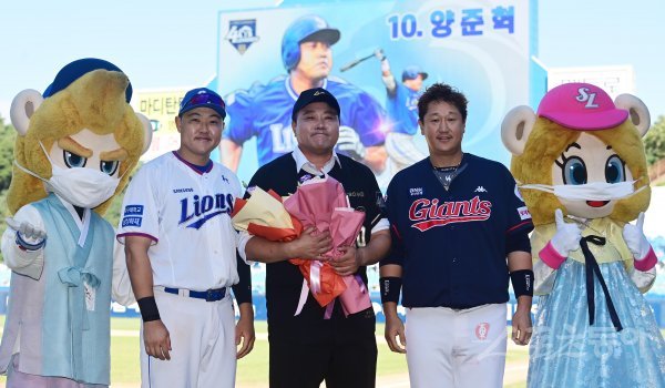 9일 대구 삼성라이온즈파크에서 열린 ‘2022 신한은행 SOL KBO리그’ 삼성 라이온즈와 롯데 자이언츠의 경기에서 레전드 40인에 선정된 양준혁이 삼성 오재일, 롯데 이대호와 기념 촬영을 하고 있다.