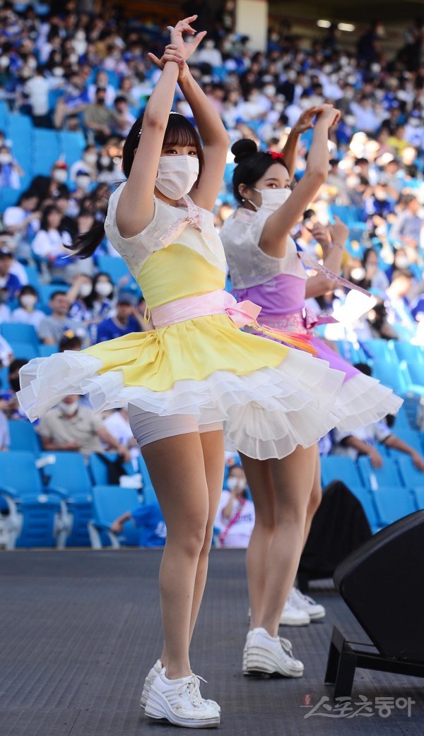 9일 대구 삼성라이온즈파크에서 열린 ‘2022 신한은행 SOL KBO리그’ 삼성 라이온즈와 롯데 자이언츠의 경기에서 삼성 치어리더들이 단상에서 공연을 펼치고 있다.