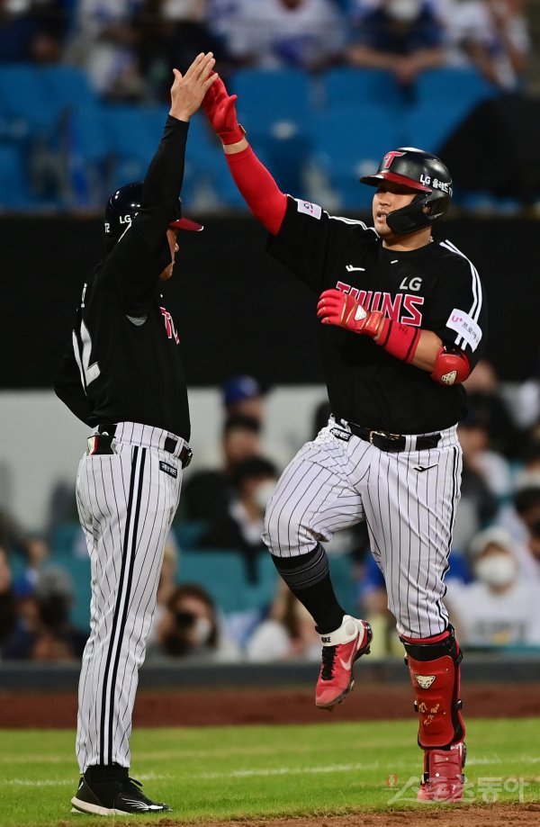 10일 대구 삼성라이온즈파크에서 열린 ‘2022 신한은행 SOL KBO리그’ 삼성 라이온즈와 LG 트윈스의 경기에서 5회초 1사 2루 LG 유강남이 중월 투런 홈런을 친 후 3루코치와 기쁨을 나누고 있다.