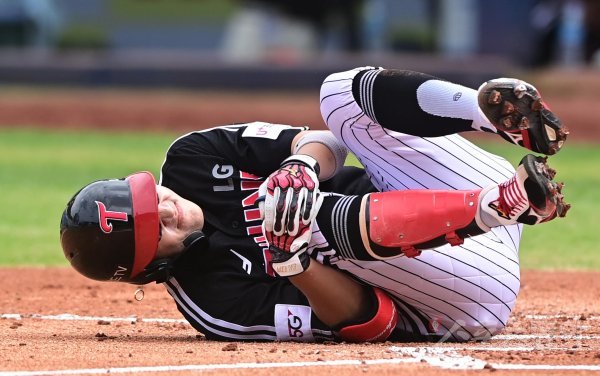 11일 대구 삼성라이온즈파크에서 열린 ‘2022 신한은행 SOL KBO리그’ 삼성 라이온즈와 LG 트윈스의 경기에서 3회초 무사 1루 LG 박해민이 자신의 파울 볼에 무릎을 맞은 후 고통을 호소하고 있다.