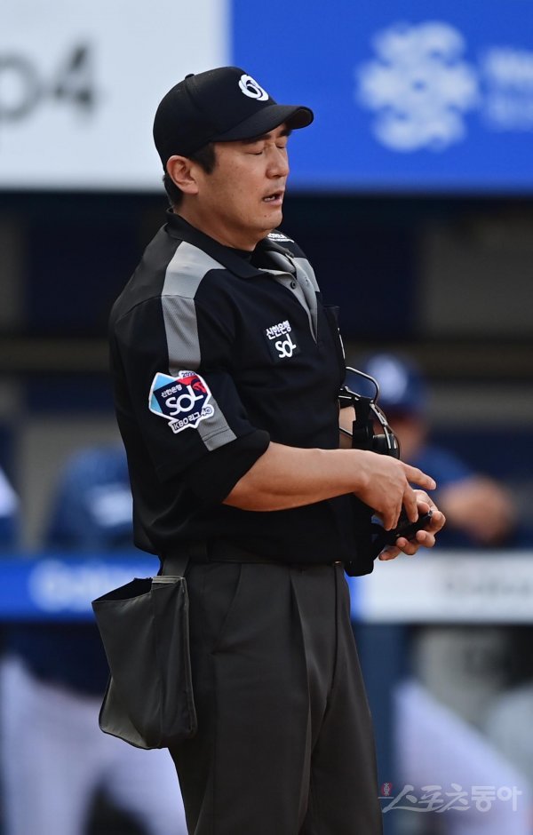 11일 대구 삼성라이온즈파크에서 열린 ‘2022 신한은행 SOL KBO리그’ 삼성 라이온즈와 LG 트윈스의 경기에서 7회초 2사 LG의 파울볼에 얼굴을 맞은 송수근 심판이 통증을 호소하고 있다.