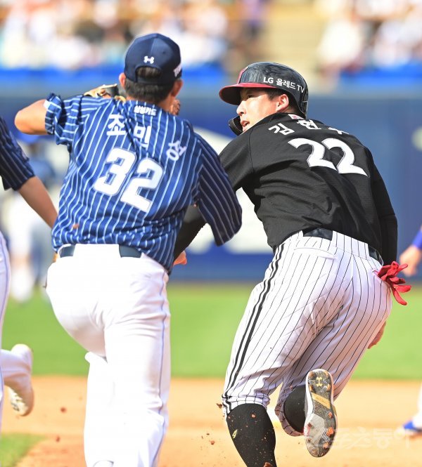 11일 대구 삼성라이온즈파크에서 열린 ‘2022 신한은행 SOL KBO리그’ 삼성 라이온즈와 LG 트윈스의 경기에서 6회초 1사 1루 LG의 내야 땅볼 때 1루주자 김현수가 삼성 1루수에게 태그 아웃되고 있다.