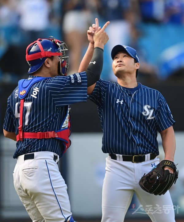 11일 대구 삼성라이온즈파크에서 열린 ‘2022 신한은행 SOL KBO리그’ 삼성 라이온즈와 LG 트윈스의 경기에서 LG에 3-1로 승리한 삼성 강민호가 강민호와 세리머니를 하고 있다.