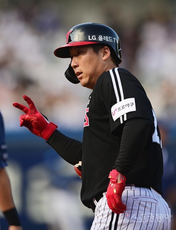 11일 대구 삼성라이온즈파크에서 열린 ‘2022 신한은행 SOL KBO리그’ 삼성 라이온즈와 LG 트윈스의 경기에서 8회초 2사 1루 LG 김현수가 우전 안타를 친 후 더그아웃을 향해 세리머니를 하고 있다.