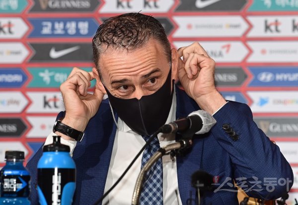 한국축구대표팀 파울루 벤투 감독이 13일 서울 종로구 축구회관에서 열린 9월 친선경기를 대비한 남자대표팀 명단발표 기자회견에서 마스크를 고쳐 쓰고 있다.
