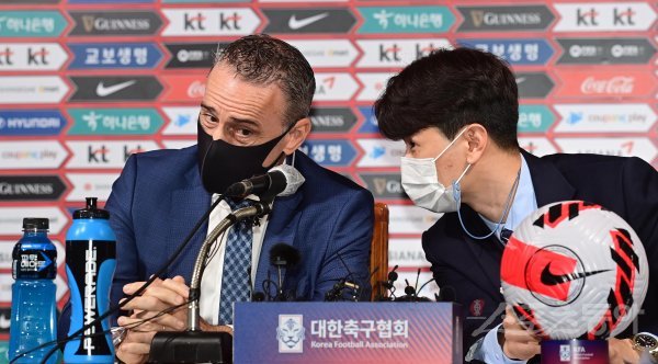 한국축구대표팀 파울루 벤투 감독이 13일 서울 종로구 축구회관에서 열린 9월 친선경기를 대비한 남자대표팀 명단발표 기자회견에서 취재진의 질문을 통역사로부터 듣고 있다.