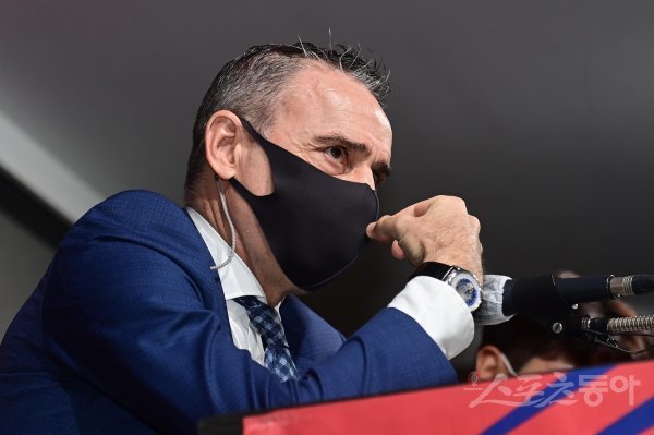 한국축구대표팀 파울루 벤투 감독이 13일 서울 종로구 축구회관에서 열린 9월 친선경기를 대비한 남자대표팀 명단발표 기자회견에서 취재진의 질문을 듣고 있다.