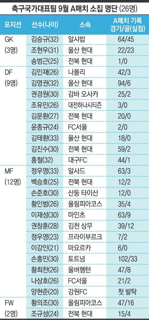 예상대로 유럽파 대부분이 승선했다. 주장 손흥민(30·토트넘)과 중앙수비수 김민재(26·나폴리), 스트라이커 황의조(30), 중앙 미드필더 황인범(26·이상 올림피아코스), 2선 공격수 이재성(30·마인츠), 다용도 미드필더 정우영(23·프라이부르크) 등이 부름을 받았다. 대표팀이 해외파를 총동원하는 것은 브라질~칠레~파라과이~이집트로 이어진 6월 A매치 4연전 이후 3개월여 만으로, 특히 9월 2연전은 월드컵 개막을 불과 2개월 앞둔 시점이라 사실상 마지막 시험무대로 볼 수 있다.