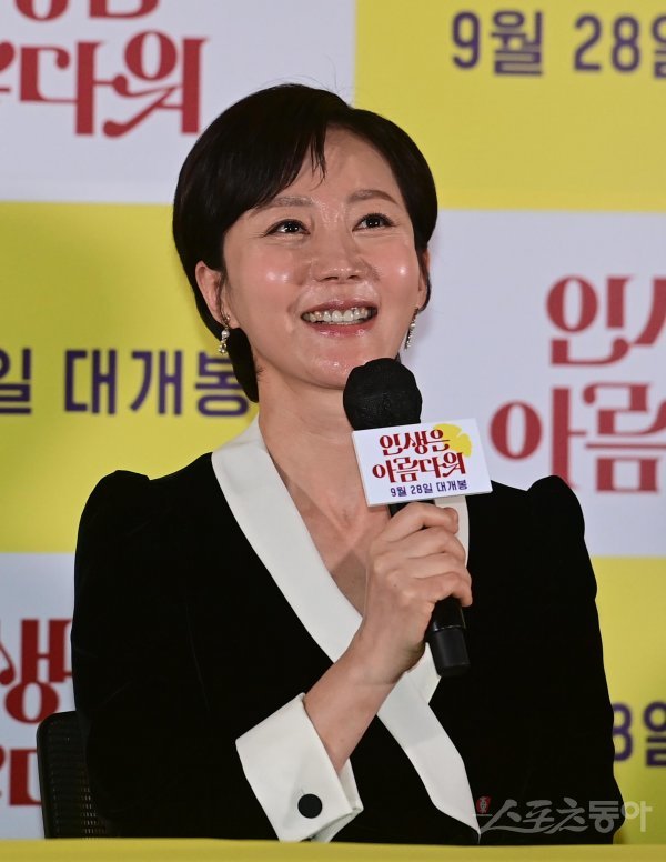 배우 염정아가 13일 서울 송파구 신천동 롯데시네마 월드타워점에서 열린 영화 ‘인생은 아름다워’ 언론시사회에서 취재진의 질문에 답하고 있다.
