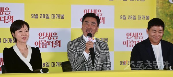 배우 류승룡과 13일 서울 송파구 신천동 롯데시네마 월드타워점에서 열린 영화 ‘인생은 아름다워’ 언론시사회에서 질문에 답하며 노래를 하고 있다.