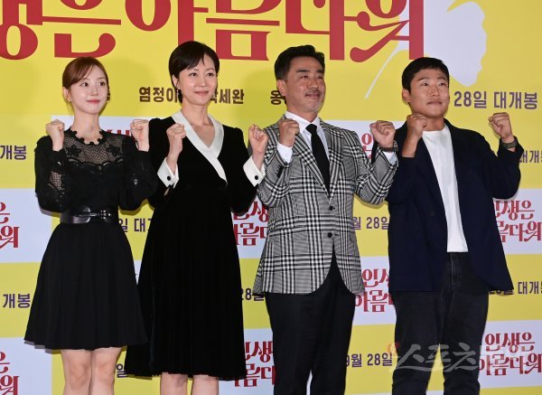 배우 박세완, 염정아, 류승룡, 최국희 감독이 13일 서울 송파구 신천동 롯데시네마 월드타워점에서 열린 영화 ‘인생은 아름다워’ 언론시사회에서 포즈를 취하고 있다.